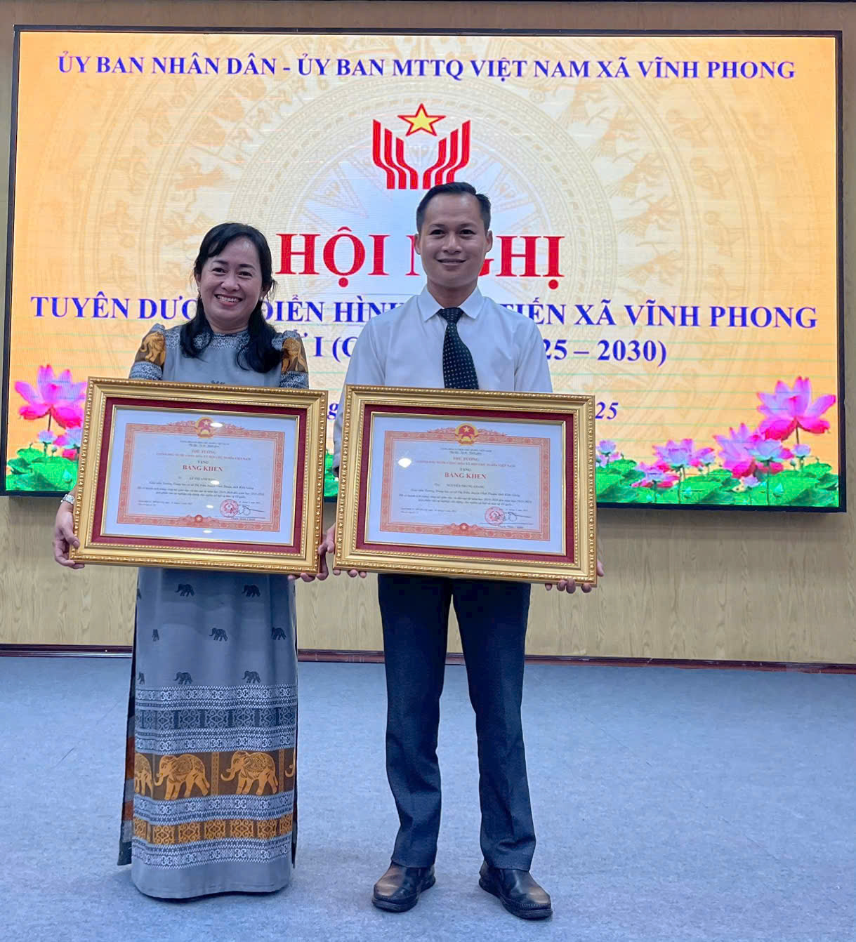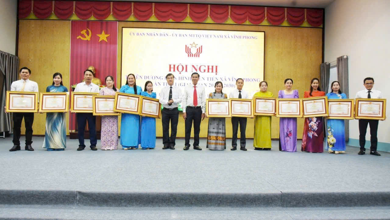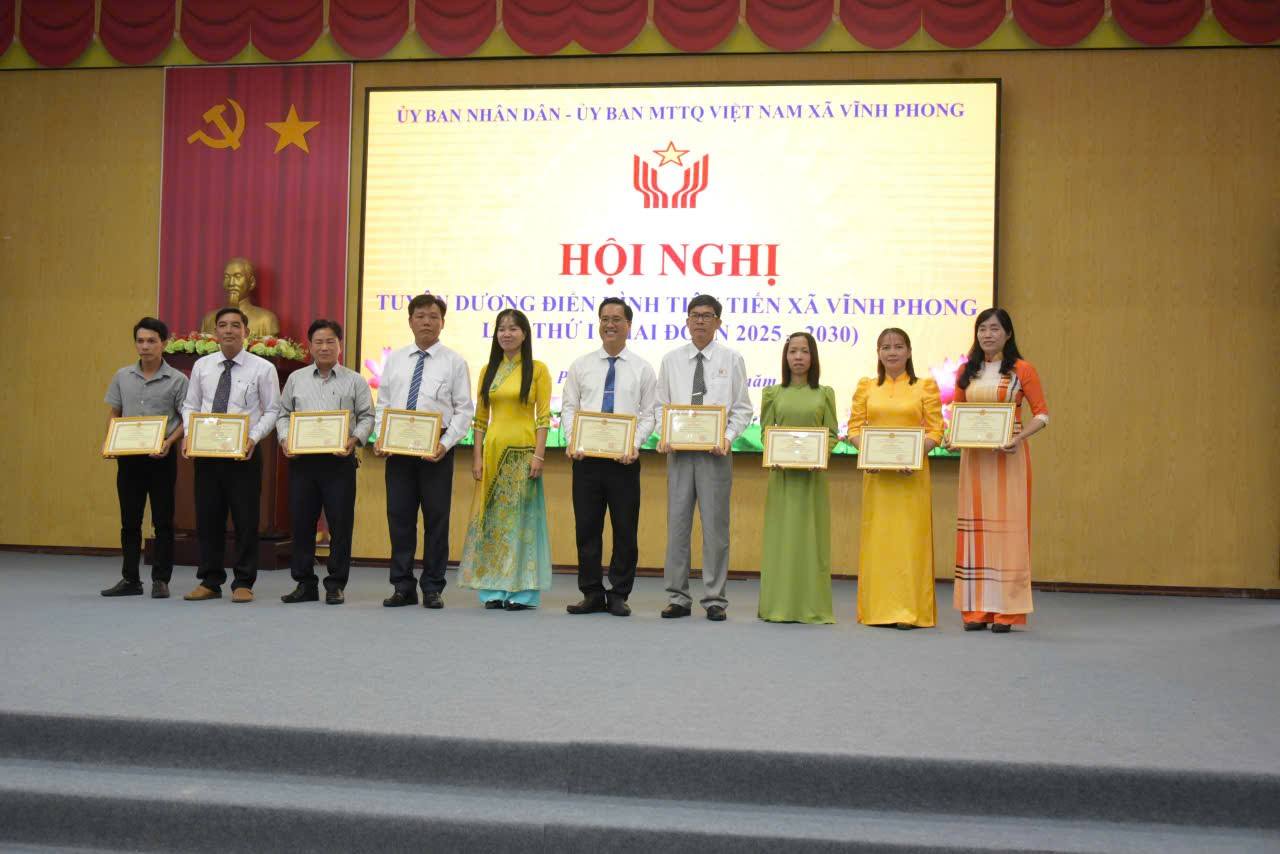 Ngày 30 tháng 08 năm 2025, tại Hội trường UBND xã Vĩnh Phong, UBND xã và Ban Chỉ đạo phong trào thi đua xã Vĩnh Phong đã long trọng tổ chức Lễ tuyên dương điển hình tiên tiến lần thứ I nhằm ghi nhận, tôn vinh những tập thể, cá nhân tiêu biểu đã có nhiều đóng góp trong phong trào thi đua yêu nước của địa phương.