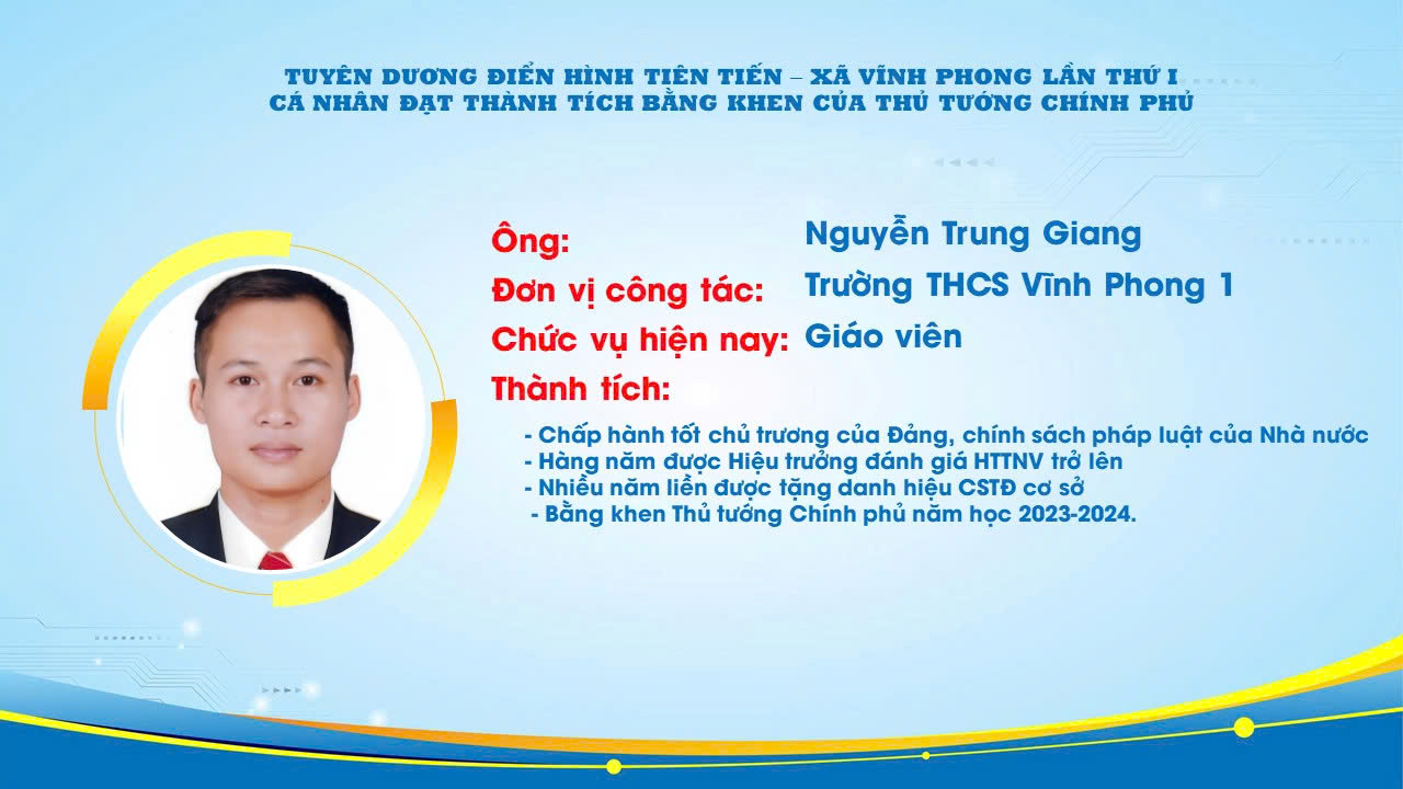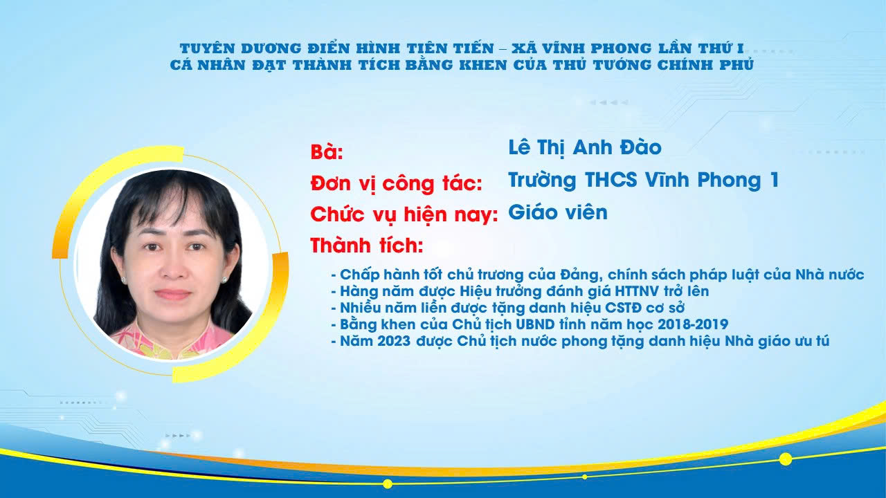 Trong số những cá nhân được biểu dương, giáo viên Trường THCS Vĩnh Phong 1 đã vinh dự được lựa chọn là điển hình tiên tiến cấp xã, nhờ những nỗ lực không ngừng trong công tác giảng dạy, giáo dục học sinh và tham gia các phong trào thi đua tại nhà trường.