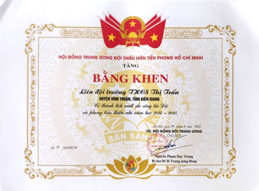 LIÊN ĐỘI NHẬN BẰNG KHEN CỦA HỘI ĐỒNG ĐỘI TRUNG ƯƠNG NĂM HỌC 2024-2025